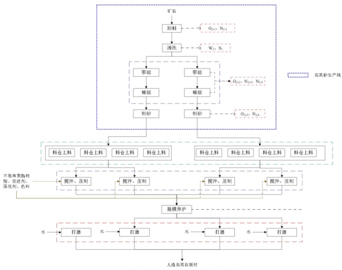人造石英石板材生產(chǎn)線:料倉(cāng)上料—混合(不飽和聚酯樹脂、促進(jìn)劑、固化劑、色料)—攪拌壓制—脫模養(yǎng)護(hù)—打磨(用水循環(huán)利用)。