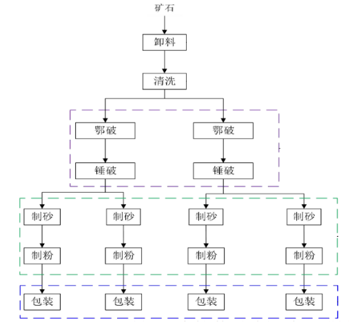 石英砂生產(chǎn)線:卸料—清洗—鄂破—錘破—制砂。