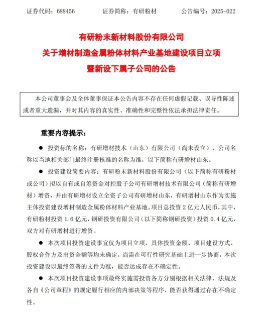 5月23日,有研增材計劃對控股子公司有研增材技術(shù)有限公司增資,并由有研增材設(shè)立全資子公司有研增材技術(shù)(山東)有限公司,作為實施主體投資建設(shè)增材制造金屬粉體材料產(chǎn)業(yè)基地。