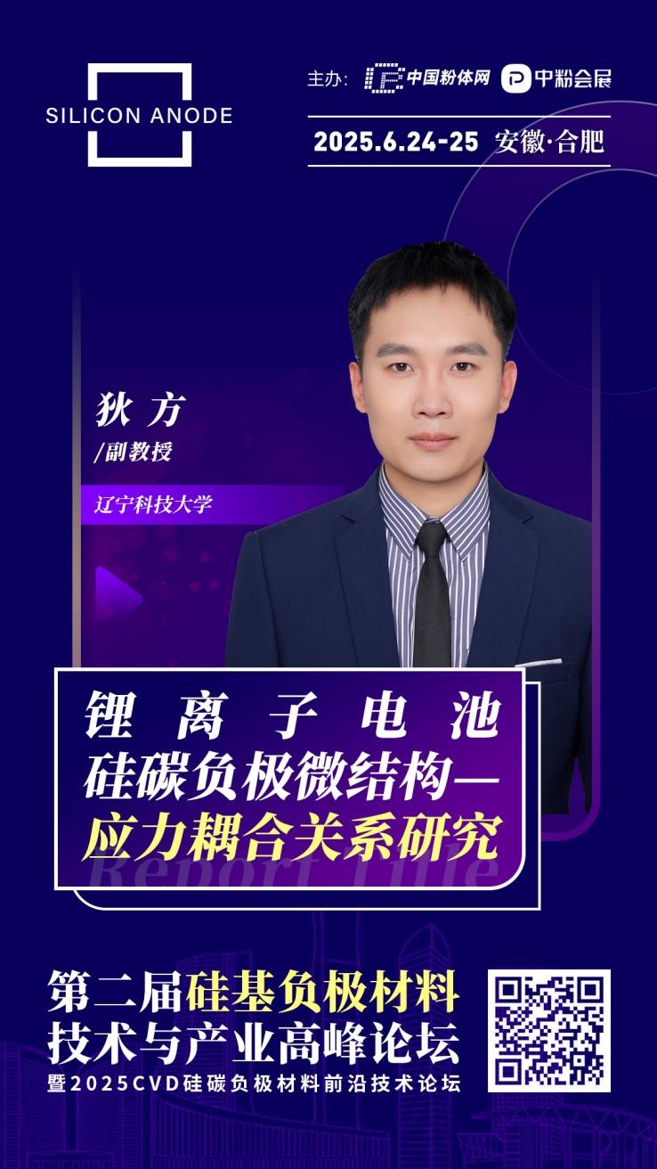 針對(duì)各類負(fù)極材料的產(chǎn)業(yè)化技術(shù)與國(guó)內(nèi)外市場(chǎng)狀況,中國(guó)粉體網(wǎng)將于2025年6月24-25日在安徽·合肥舉辦第二屆硅基負(fù)極材料技術(shù)與產(chǎn)業(yè)高峰論壇暨2025CVD硅碳負(fù)極材料前沿技術(shù)論壇。大會(huì)旨在為負(fù)極材料產(chǎn)業(yè)鏈上中下游企業(yè)搭建深度交流的平臺(tái),開展產(chǎn)、學(xué)、研合作,助推負(fù)極材料行業(yè)持續(xù)健康發(fā)展。屆時(shí),來自遼寧科技大學(xué)的狄方副教授將作題為《鋰離子電池硅碳負(fù)極微結(jié)構(gòu)—應(yīng)力耦合關(guān)系研究》的報(bào)告。