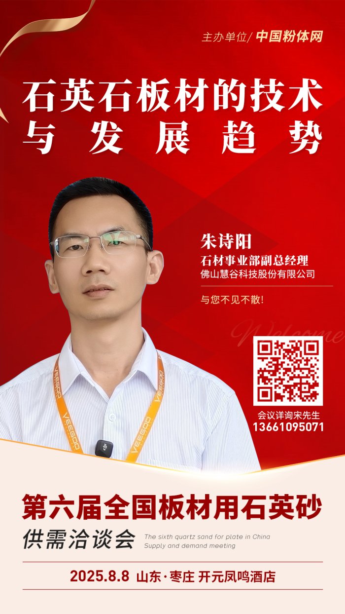 2025年8月8日,由中國(guó)粉體網(wǎng)主辦的第六屆全國(guó)板材用石英砂供需洽談會(huì)將在山東棗莊召開(kāi),佛山慧谷科技股份有限公司石材事業(yè)部副總經(jīng)理朱詩(shī)陽(yáng)將做《石英石板材的技術(shù)與發(fā)展趨勢(shì)》的報(bào)告,圍繞行業(yè)痛點(diǎn)深入解析未來(lái)技術(shù)方向,誠(chéng)邀行業(yè)同仁共探發(fā)展新機(jī)。