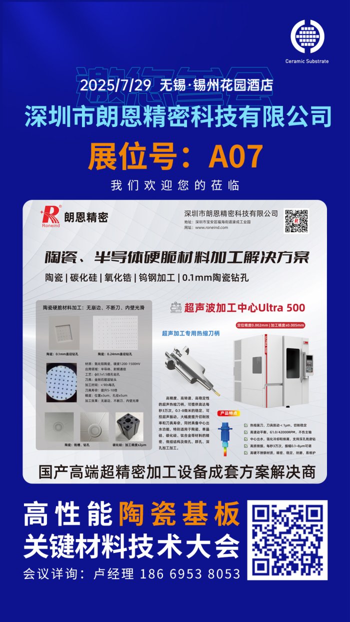 高性能陶瓷基板關(guān)鍵材料技術(shù)大會將于2025年7月29日在江蘇無錫舉辦。深圳市朗恩精密科技有限公司作為參展單位邀請您共同出席。