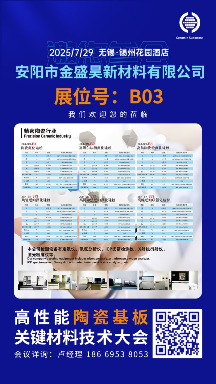高性能陶瓷基板關(guān)鍵材料技術(shù)大會將于2025年7月29日在江蘇無錫舉辦。安陽市金盛昊新材料有限公司作為參展單位邀請您共同出席。
