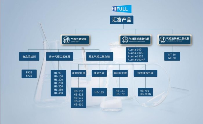 匯富納米氣相二氧化硅分為親水型和疏水型兩大系列,親水型產(chǎn)品7款、疏水型(特殊硅烷處理)產(chǎn)品10款,疏水型氣相二氧化硅產(chǎn)品型號及種類齊全,在行業(yè)內(nèi)是一項巨大優(yōu)勢。目前產(chǎn)品在硅橡膠、彈性體、涂料、油墨、膠粘劑、絕緣子、復(fù)合材料、樹脂、塑料、膠體電池、消泡劑、建筑材料、農(nóng)業(yè)、化妝品、食品、醫(yī)藥、保溫材料、化學(xué)機械拋光等領(lǐng)域均有應(yīng)用。