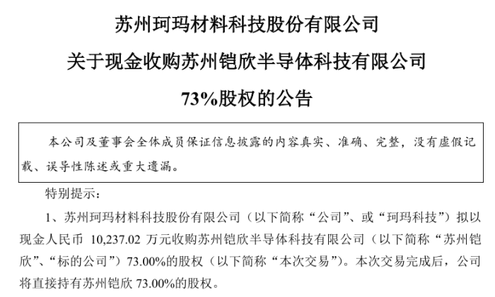 7月22日,蘇州珂瑪材料科技股份有限公司(簡稱“珂瑪科技”)發(fā)布公告,擬以現(xiàn)金人民幣1.02 億元收購蘇州鎧欣半導(dǎo)體科技有限公司(簡稱“鎧欣半導(dǎo)體”)73.00%的股權(quán)。本次交易完成后,公司將直接持有鎧欣半導(dǎo)體73.00%的股權(quán),并成為鎧欣半導(dǎo)體的控股股東。