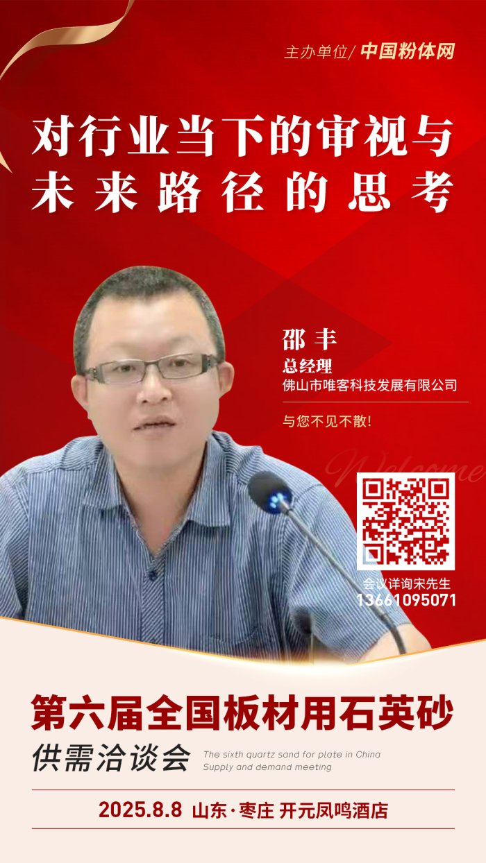 2025年8月8日,由中國(guó)粉體網(wǎng)主辦的第六屆全國(guó)板材用石英砂供需洽談會(huì)即將在山東棗莊召開(kāi),佛山市唯客科技發(fā)展有限公司總經(jīng)理邵豐將做《對(duì)行業(yè)當(dāng)下的審視與未來(lái)路徑的思考》的報(bào)告,屆時(shí),他將圍繞該核心議題展開(kāi)詳細(xì)解讀。