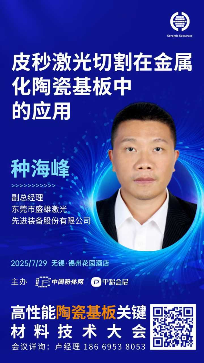 半導(dǎo)體及電子信息產(chǎn)業(yè)的快速發(fā)展對核心材料的性能提出了更高要求。陶瓷基板作為功率半導(dǎo)體器件的關(guān)鍵封裝材料,其導(dǎo)熱性能、機械強度、可靠性和精密程度直接決定了終端產(chǎn)品的性能與壽命。針對材料研發(fā)、制備工藝、檢測技術(shù)、應(yīng)用場景等核心議題,中國粉體網(wǎng)將于2025年7月29日在江蘇無錫舉辦2025高性能陶瓷基板關(guān)鍵材料技術(shù)大會。屆時,東莞市盛雄激光先進裝備股份有限公司副總經(jīng)理種海峰將作題為《皮秒激光切割在金屬化陶瓷基板中的應(yīng)用》的報告,報告主要涵蓋市場容量、頭部客戶皮秒應(yīng)用情況、傳統(tǒng)激光切割工藝不足、皮秒切割陶瓷基板的優(yōu)勢、未來技術(shù)趨勢等。