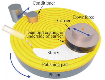 金剛石拋光技術(shù)主要有機(jī)械拋光、熱化學(xué)拋光、激光拋光和化學(xué)機(jī)械拋光等,其中化學(xué)機(jī)械拋光(CMP)通過(guò)在機(jī)械拋光過(guò)程中加入氧化劑,氧化碳原子提高拋光速率,是一種利用機(jī)械與化學(xué)氧化協(xié)同作用來(lái)實(shí)現(xiàn)工件表面平坦化的技術(shù),具有表面損傷小、粗糙度低、設(shè)備簡(jiǎn)單、運(yùn)行維護(hù)成本低,拋光后的表面污染較輕等優(yōu)點(diǎn)。