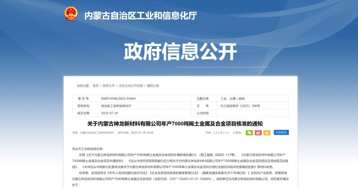 中國粉體網(wǎng)訊 近日,內(nèi)蒙古自治區(qū)工業(yè)和信息化廳同意核準(zhǔn)內(nèi)蒙古神龍新材料有限公司(以下簡稱“神龍新材料”)年產(chǎn)7000噸稀土金屬及合金項(xiàng)目。