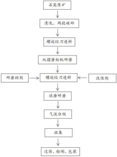 另外廣源化工等還公開了一種低電導(dǎo)率超細(xì)硅微粉及其制備方法和應(yīng)用。此發(fā)明對原料進(jìn)行一次濕式磁選,降低原料中的鐵含量;超細(xì)研磨時與物料接觸的設(shè)備均采用耐磨材料進(jìn)行處理,防止鐵雜質(zhì)的帶入;研磨后引入硅烷偶聯(lián)劑包覆進(jìn)行分級,防止大顆粒團(tuán)聚;分級后再次濕式磁選,控制硅微粉極低的鐵含量,保證了硅微粉極低的電導(dǎo)率。