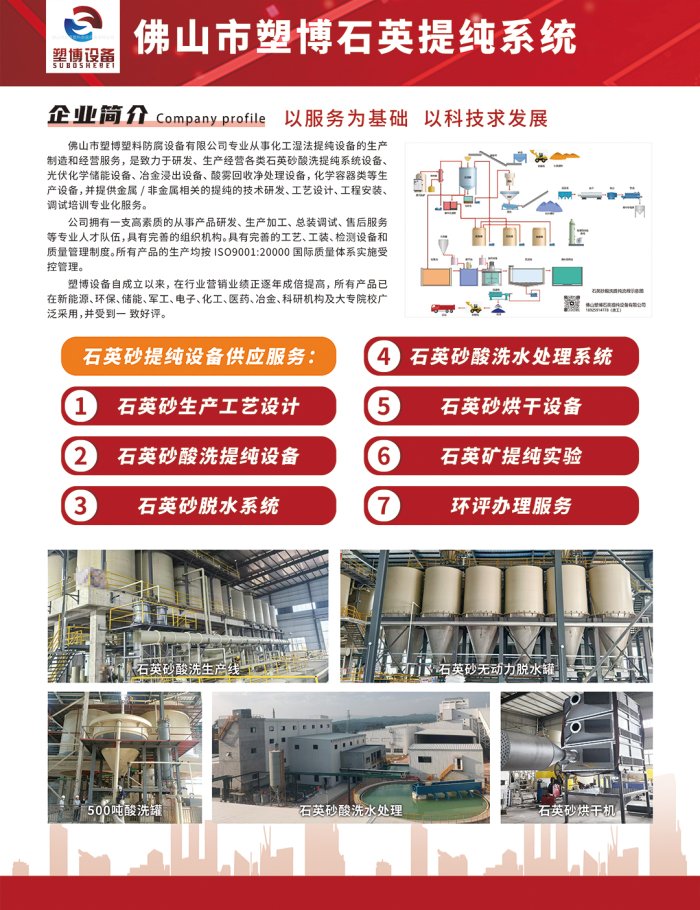佛山市塑博塑料防腐設(shè)備有限公司專業(yè)從事化工濕法提純設(shè)備的生產(chǎn)制造和經(jīng)營服務(wù),是致力于研發(fā)、生產(chǎn)經(jīng)營各類石英砂酸洗提純系統(tǒng)設(shè)備光伏化學儲能設(shè)備、冶金浸出設(shè)備、酸霧回收凈處理設(shè)備,化學容器類等生產(chǎn)設(shè)備,并提供金屬/非金屬相關(guān)的提純的技術(shù)研發(fā)、工藝設(shè)計、工程安裝、調(diào)試培訓專業(yè)化服務(wù)。