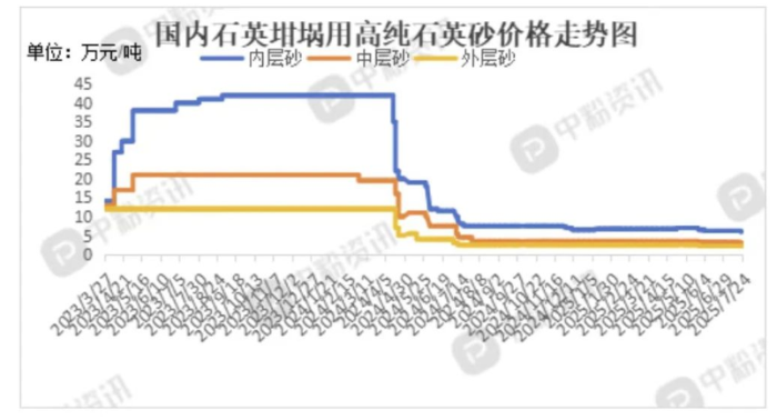 2024年,光伏行業(yè)產(chǎn)能集中釋放引發(fā)激烈競(jìng)爭(zhēng),產(chǎn)業(yè)鏈結(jié)構(gòu)性利潤(rùn)下滑逐步傳導(dǎo)至全鏈條,石英材料首當(dāng)其沖。從第二季度開(kāi)始,高純石英砂價(jià)格開(kāi)啟“自由落體”模式:國(guó)產(chǎn)外層砂、中層砂價(jià)格先“腰斬”,再“膝斬”。