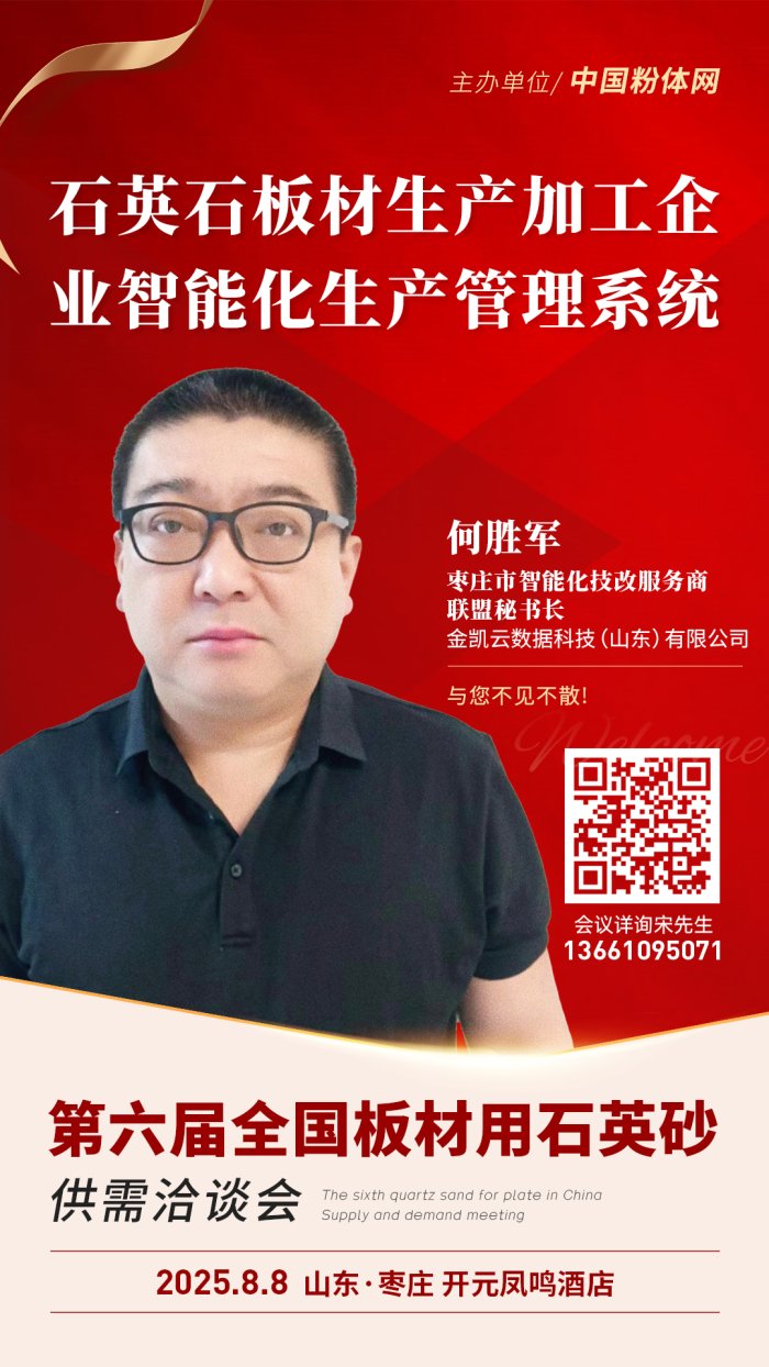 2025年8月8日,由中國粉體網(wǎng)主辦的第六屆全國板材用石英砂供需洽談會即將在山東棗莊召開,金凱云數(shù)據(jù)科技(山東)有限公司/棗莊市智能化技改服務(wù)商聯(lián)盟秘書長何勝軍將作《石英石板材生產(chǎn)加工企業(yè)智能化生產(chǎn)管理系統(tǒng)》的報(bào)告,屆時,他將圍繞該核心議題展開詳細(xì)解讀。