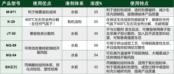 對(duì)此,至禾新從自身助劑體系出發(fā),致力于解決噴霧造粒粉體成型燒結(jié)過(guò)程中出現(xiàn)的各種缺陷或開(kāi)裂問(wèn)題,開(kāi)發(fā)了一系列粘結(jié)劑產(chǎn)品,受到行業(yè)的高度認(rèn)可。至禾新粘結(jié)劑型號(hào)眾多,可滿(mǎn)足水系、有機(jī)溶劑體系,也可滿(mǎn)足各類(lèi)無(wú)機(jī)化合物、金屬粉體用戶(hù)無(wú)殘留、高強(qiáng)度等不同訴求。