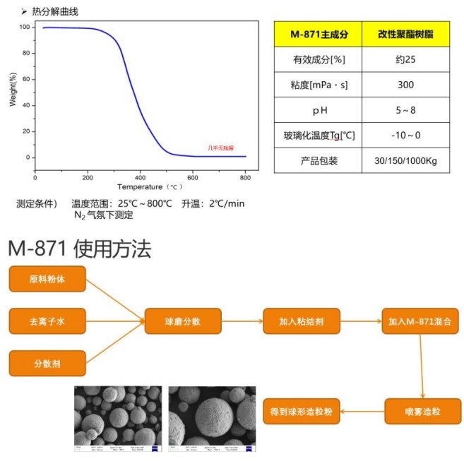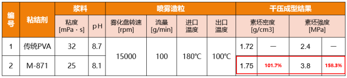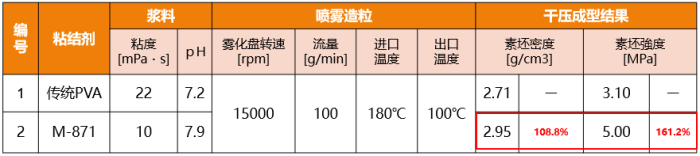 M-871表現(xiàn):素坯強(qiáng)度突破5.0 MPa(較PVA提升61.2%),密度提升至2.95 g/cm3,助力高精度陶瓷器件生產(chǎn)。
