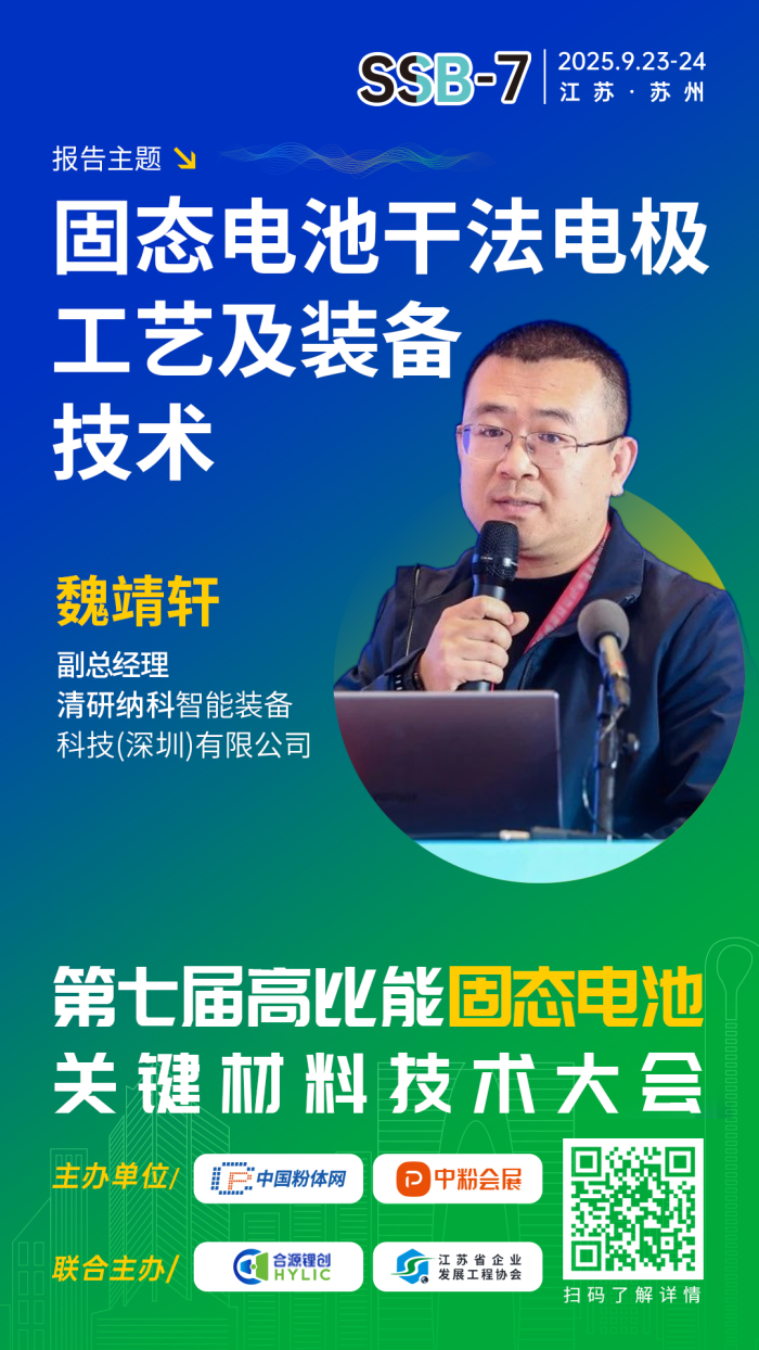 中國(guó)粉體網(wǎng)聯(lián)合合源鋰創(chuàng)、江蘇省企業(yè)發(fā)展工程協(xié)會(huì),將于2025年9月23-24日在蘇州舉辦第七屆高比能固態(tài)電池關(guān)鍵材料技術(shù)大會(huì)。本次大會(huì)將聚焦固態(tài)電解質(zhì)、正負(fù)極材料、界面工程、智能制造及產(chǎn)業(yè)化進(jìn)展等熱點(diǎn)議題,深入探討固態(tài)電池的未來(lái)發(fā)展趨勢(shì)及挑戰(zhàn)。為致力于固態(tài)電池技術(shù)開(kāi)發(fā)的企業(yè),科研院校,以及新能源汽車(chē)、儲(chǔ)能、消費(fèi)電子等終端企業(yè)提供信息交流的平臺(tái),開(kāi)展產(chǎn)、學(xué)、研合作,助推固態(tài)電池產(chǎn)業(yè)化。屆時(shí),清研納科智能裝備科技(深圳)有限公司副總經(jīng)理魏靖軒將作題為《固態(tài)電池干法電極工藝及裝備技術(shù)》的報(bào)告。