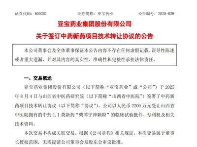 中國(guó)粉體網(wǎng)訊 8月5日,亞寶藥業(yè)公告,公司于2025年8月4日與山西省中醫(yī)藥研究院簽署了中藥新藥項(xiàng)目技術(shù)轉(zhuǎn)讓協(xié)議。公司以人民幣2200萬(wàn)元受讓山西省中醫(yī)院擁有的中藥1.1類新藥“柴芩寧神顆!钡呐R床試驗(yàn)批件、專利權(quán)及相關(guān)技術(shù)資料。