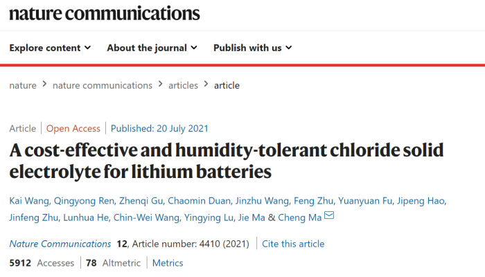 2021年7月20日,馬騁教授團隊設計并合成了一種新型氯化物固態(tài)電解質(zhì)—氯化鋯鋰(Li2ZrCl6)。這一材料成功將50微米厚度時的原材料成本降低至1.38美元/平方米,罕見的遠遠低于10美元/平方米這一確保全固態(tài)電池市場競爭力的閾值,而此前最廉價的氯化物固態(tài)電解質(zhì)相對應的成本為23.05美元/平方米,遠遠超過這一閾值。除此之外,氯化鋯鋰在濕度高達5%(對應露點-15℃)時仍保持穩(wěn)定,因此其合成和儲存對氣氛的要求并不苛刻,進一步降低了生產(chǎn)成本。該成果以“A cost-effective and humidity-tolerant chloride solidelectrolyte forlithium batteries”為題發(fā)表在國際著名學術期刊Nature Communications上。