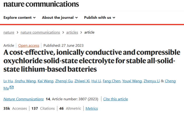 2023年6月27日,馬騁教授團隊報道了一種新型固態(tài)電解質(zhì)——氧氯化鋯鋰,它的綜合性能和目前最先進的硫化物、氯化物固態(tài)電解質(zhì)相近,但成本不到后者的4%,很適合產(chǎn)業(yè)化應用。該成果以“A cost-effective, ionically conductive and compressible oxychloride solid-state electrolyte for stable all-solid-state lithium-based batteries”為題發(fā)表在國際著名學術期刊Nature Communications上。
