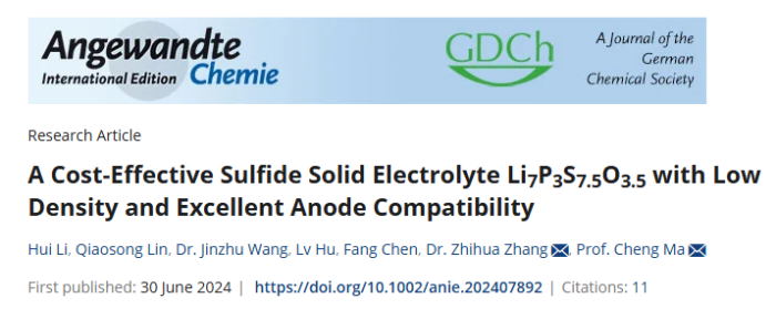2024年6月30日,中國科學技術大學馬騁教授開發(fā)了一種新型硫化物固態(tài)電解質(zhì)。這種固態(tài)電解質(zhì)在展示硫化物固態(tài)電解質(zhì)固有優(yōu)勢的同時,實現(xiàn)了其它硫化物固態(tài)電解質(zhì)所無法達到的極其低廉、適合商業(yè)化的成本。該成果以“A Cost-Effective Sulfide Solid Electrolyte Li7P3S7.5O3.5 with Low Density and Excellent Anode Compatibility”為題發(fā)表在國際學術期刊Angewandte Chemie International Edition上。
