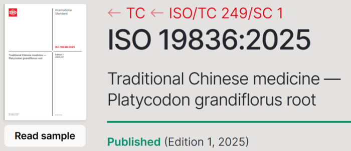 中國(guó)粉體網(wǎng)訊 近日,由市藥檢院中藥所牽頭制定的桔梗國(guó)際標(biāo)準(zhǔn)(ISO 19836:2025 Traditional Chinese medicine—Platycodon grandiflorus root)經(jīng)國(guó)際標(biāo)準(zhǔn)化組織(ISO)批準(zhǔn)正式發(fā)布,這是首個(gè)由我國(guó)藥檢系統(tǒng)牽頭制定的中藥材ISO國(guó)際標(biāo)準(zhǔn)。