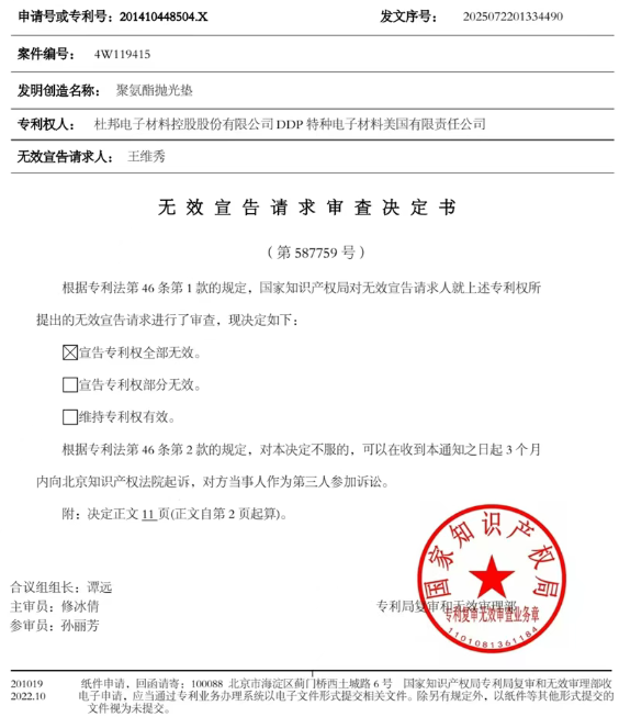 近日,國(guó)家知識(shí)產(chǎn)權(quán)局消息,杜邦電子材料控股股份有限公司、杜邦全資子公司DDP特種電子材料美國(guó)有限責(zé)任公司擁有的一項(xiàng)名為“聚氨酯拋光墊”的專利(專利號(hào):ZL201410448504.X)因不具備創(chuàng)造性,而被宣告權(quán)利要求全部無(wú)效。