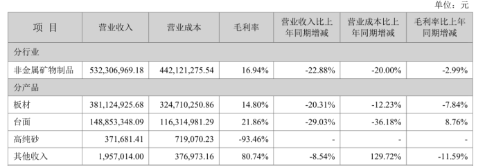 中旗新材2024年年度報告的數(shù)據(jù)也印證了高純砂業(yè)務(wù)的困境。報告顯示,公司全年實現(xiàn)營業(yè)收入5.32億元,同比下降22.88%;歸屬于上市公司股東的凈利潤為3051.15萬元。其中,高純砂業(yè)務(wù)表現(xiàn)尤為慘淡,營業(yè)收入僅為371,681.41元,而營業(yè)成本卻高達(dá)719,070.23元,毛利率低至-93.46%,陷入嚴(yán)重虧損狀態(tài)。