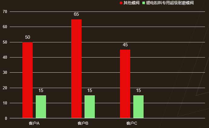 ④綜合計(jì)算,使用鋰電粉料專用超級(jí)耐磨蝶閥使用成本僅為其他蝶閥的30%,可為客戶節(jié)約70%蝶閥成本。