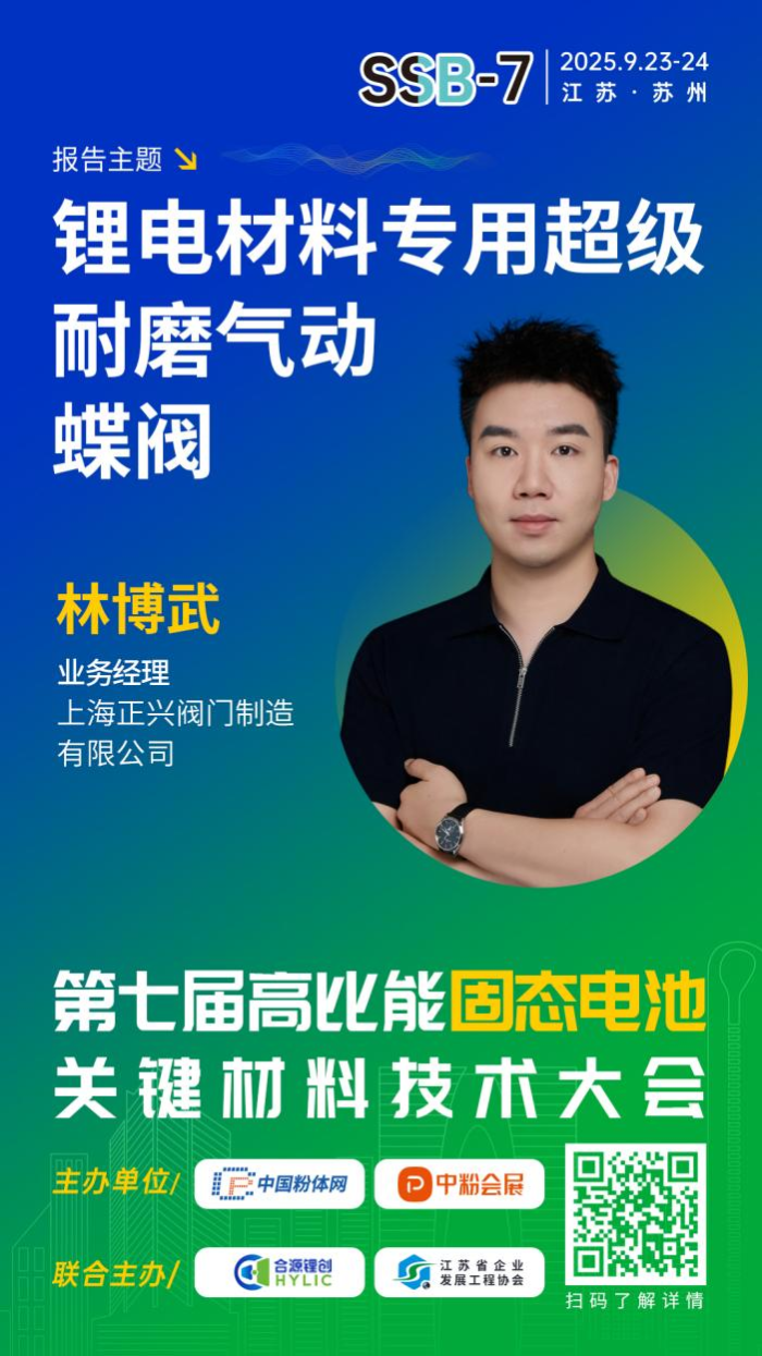 2025年9月23-24日,上海正興閥門制造有限公司將在中國粉體網(wǎng)聯(lián)合合源鋰創(chuàng)、江蘇省企業(yè)發(fā)展工程協(xié)會(huì)舉辦的第七屆高比能固態(tài)電池關(guān)鍵材料技術(shù)大會(huì)上進(jìn)行產(chǎn)品展示,并且公司業(yè)務(wù)經(jīng)理林博武將作題為《鋰電材料專用超級(jí)耐磨氣動(dòng)蝶閥》的報(bào)告,歡迎業(yè)界同仁前來參觀交流。