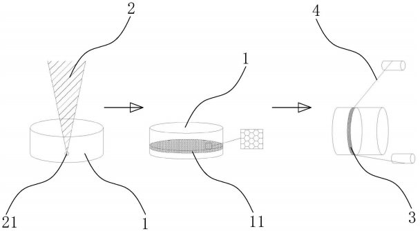 本發(fā)明公開(kāi)了一種大尺寸金剛石的切割方法,包括有以下步驟:S1、在金剛石上選定需要切割的分離面;S2、激光的入射方向與分離面處于非平行狀態(tài),將激光的焦點(diǎn)聚焦在分離面上;S3、僅將分離面上的金剛石進(jìn)行石墨化形成石墨層,激光焦點(diǎn)在加工范圍內(nèi)進(jìn)行非完全石墨化,單位空間內(nèi)的晶體石墨化比例介于20%到95%之間;S4、用線(xiàn)鋸對(duì)石墨層進(jìn)行切割,將金剛石從分離面處分離。在本申請(qǐng)中并不采用激光直接進(jìn)行切割方式,而是對(duì)激光在加熱金剛石過(guò)程中能夠形成石墨層的方式進(jìn)行利用,通過(guò)線(xiàn)切割的方式能夠?qū)⑹珜舆M(jìn)行切割,提高了加工效率。