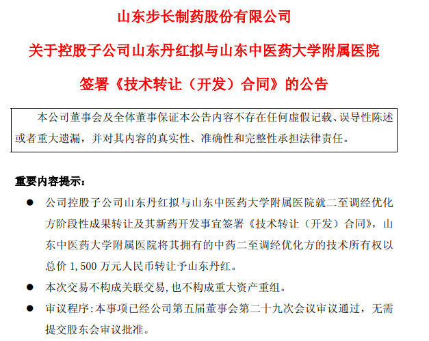 山東中醫(yī)藥大學(xué)附屬醫(yī)院將其擁有的中藥二至調(diào)經(jīng)優(yōu)化方的技術(shù)所有權(quán)以總價(jià)1500萬(wàn)元人民幣轉(zhuǎn)讓予山東丹紅,雙方將依據(jù)合同中所約定的責(zé)任和義務(wù),遵循《藥品注冊(cè)管理辦法》和《中藥注冊(cè)管理專(zhuān)門(mén)規(guī)定》及相關(guān)要求,開(kāi)展中藥新藥研究,并實(shí)現(xiàn)該新藥的工業(yè)化規(guī)模生產(chǎn)。