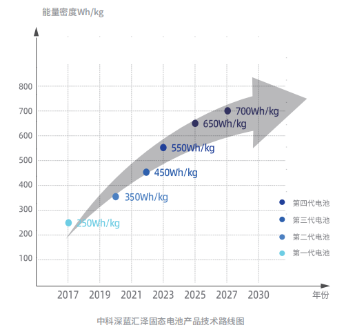 技術(shù)路線方面,中科深藍(lán)匯澤固態(tài)電池能量密度逐代提升:第一代2017年實(shí)現(xiàn)250Wh/kg,第二代2021年350Wh/kg,第三代2023年和2025年分別達(dá)到450Wh/kg和550Wh/kg,預(yù)計(jì)2027年第四代達(dá)到650Wh/kg,2030年進(jìn)一步提升至700Wh/kg。