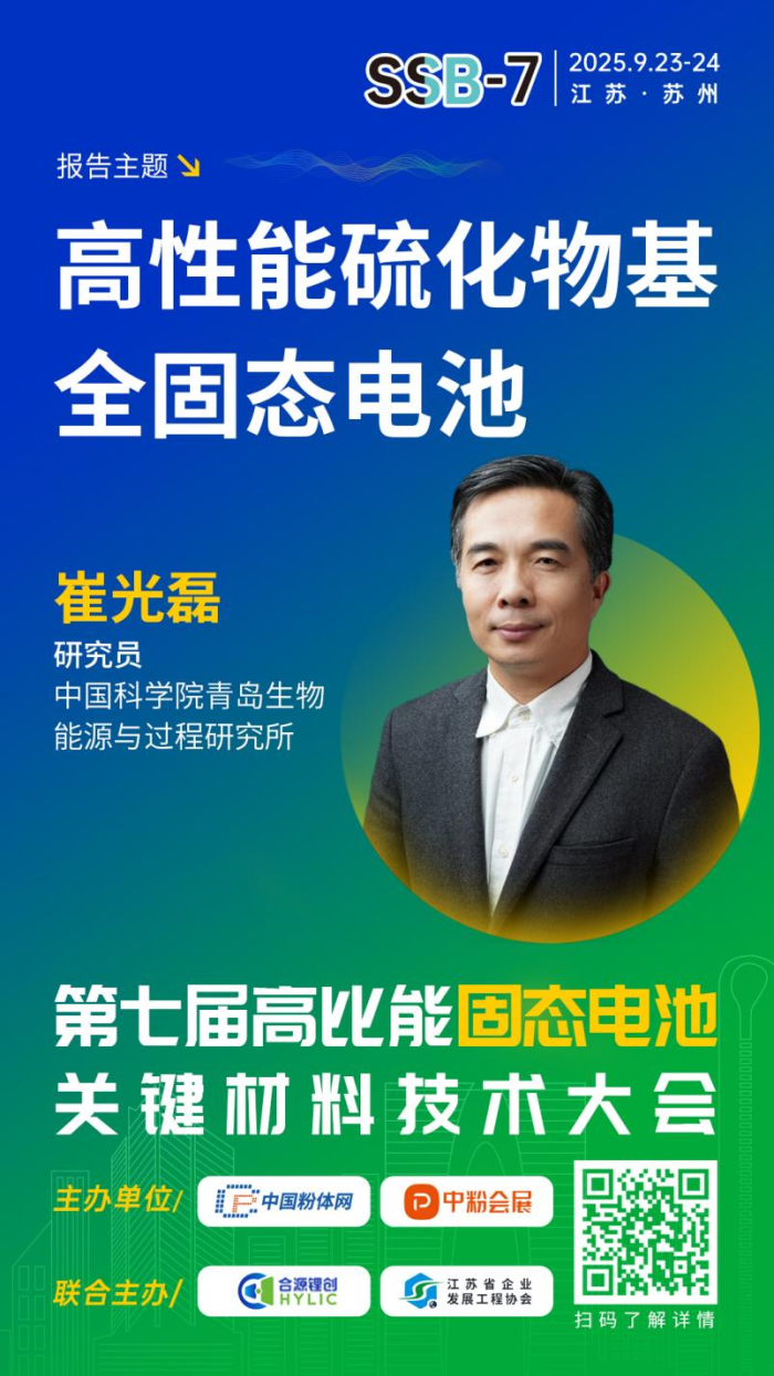 中國(guó)粉體網(wǎng)聯(lián)合合源鋰創(chuàng)、江蘇省企業(yè)發(fā)展工程協(xié)會(huì),將于2025年9月23-24日在蘇州舉辦第七屆高比能固態(tài)電池關(guān)鍵材料技術(shù)大會(huì)。本次大會(huì)將聚焦固態(tài)電解質(zhì)、正負(fù)極材料、界面工程、智能制造及產(chǎn)業(yè)化進(jìn)展等熱點(diǎn)議題,深入探討固態(tài)電池的未來發(fā)展趨勢(shì)及挑戰(zhàn)。為致力于固態(tài)電池技術(shù)開發(fā)的企業(yè),科研院校,以及新能源汽車、儲(chǔ)能、消費(fèi)電子等終端企業(yè)提供信息交流的平臺(tái),開展產(chǎn)、學(xué)、研合作,助推固態(tài)電池產(chǎn)業(yè)化。屆時(shí),中國(guó)科學(xué)院青島生物能源與過程研究所崔光磊研究員將作題為《高性能硫化物基全固態(tài)電池》的報(bào)告。