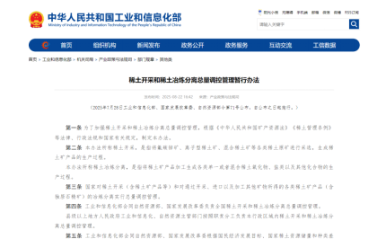 中國粉體網(wǎng)訊 為有效保護(hù)和合理開發(fā)利用寶貴的戰(zhàn)略性礦產(chǎn)資源稀土,工業(yè)和信息化部、國家發(fā)展改革委、自然資源部聯(lián)合制定的《稀土開采和稀土冶煉分離總量調(diào)控管理暫行辦法》(工業(yè)和信息化部令第71號,以下簡稱《辦法》)。該《辦法》旨在具體落實國務(wù)院《稀土管理條例》的相關(guān)規(guī)定,標(biāo)志著我國稀土開采及冶煉分離活動將全面納入更加規(guī)范、嚴(yán)格的總量調(diào)控管理體系。