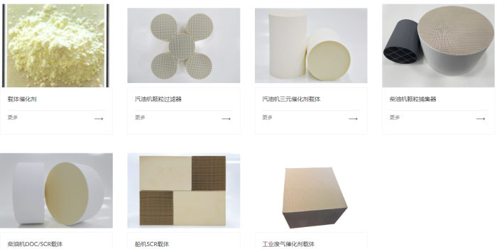 主要產(chǎn)品:氧化性催化轉(zhuǎn)化器載體、選擇性催化還原載體、三元催化轉(zhuǎn)化器載體、顆粒捕捉器、鈰鋯固溶體、分子篩
