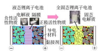 傳統(tǒng)液態(tài)鋰離子電池與全固態(tài)鋰離子電池示意圖