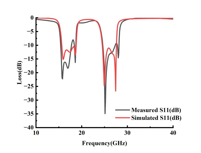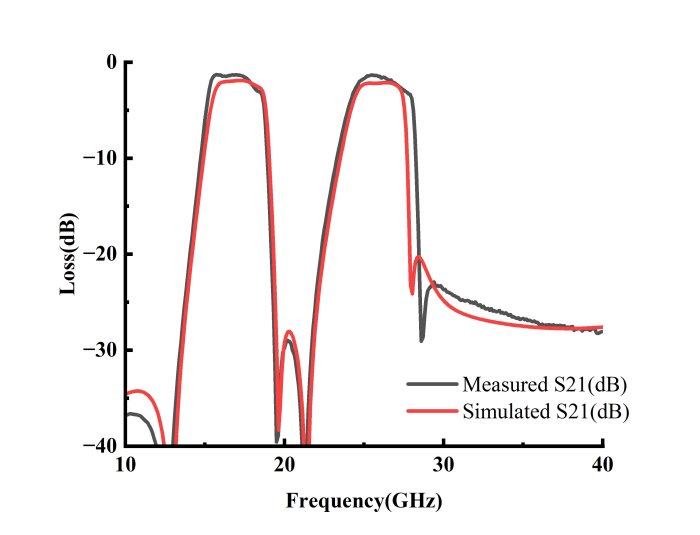 更為關(guān)鍵的是,該產(chǎn)品最終的測試結(jié)果仿真結(jié)果數(shù)據(jù)基本一致,充分驗(yàn)證了技術(shù)的可靠性與穩(wěn)定性。在性能表現(xiàn)上,其展現(xiàn)出卓越的傳輸性能,具備低插入損耗優(yōu)勢;同時(shí)擁有精準(zhǔn)的濾波特性,高選擇性特點(diǎn)顯著。以雙頻濾波器為例,從S參數(shù)對(duì)比圖可清晰看出,雙頻帶中心頻率分別精準(zhǔn)定位在16.65GHz與25.85GHz,而插入損耗僅為1.32dB與1.36dB,即便在三倍頻處,仍能實(shí)現(xiàn)20dB以上的帶外抑制,充分體現(xiàn)出良好的帶通濾波性能與高帶外抑制能力。在尺寸與性能平衡方面,該雙頻濾波器同樣表現(xiàn)亮眼,器件面積僅為0.267λ*0.222λ,在保持小巧尺寸的同時(shí),3dB分?jǐn)?shù)帶寬分別達(dá)到21.38%與15.24%,矩形系數(shù)分別為1.53與1.50,實(shí)現(xiàn)了小尺寸與高選擇比的完美兼顧,為設(shè)備的小型化、高集成化發(fā)展提供了有力支持。