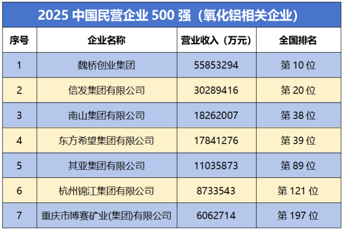 中國粉體網(wǎng)訊 8月28日,全國工商聯(lián)在遼寧沈陽發(fā)布“2025中國民營企業(yè)500強(qiáng)”,據(jù)了解,此次民營企業(yè)500強(qiáng)入圍門檻增至270.23億元。其中,共有7家氧化鋁企業(yè)入圍該榜單。