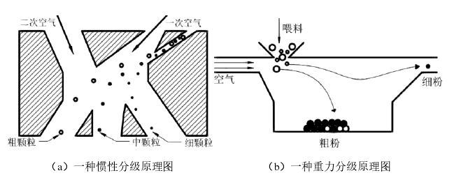 重力分級設(shè)備和慣性分級設(shè)備都分別有著不同的結(jié)構(gòu)形式,但慣性分級法和重力分級法原理基本類似:不同質(zhì)量的顆粒慣性不同,在分級設(shè)備中會產(chǎn)生不一樣的運動路線,慣性分級法就是通過這種原理達(dá)到分級目的;重力分級是根據(jù)不同質(zhì)量的顆粒在重力影響下沉降速度的差異,在分級設(shè)備中形成不同的運動路線而實現(xiàn)分級。