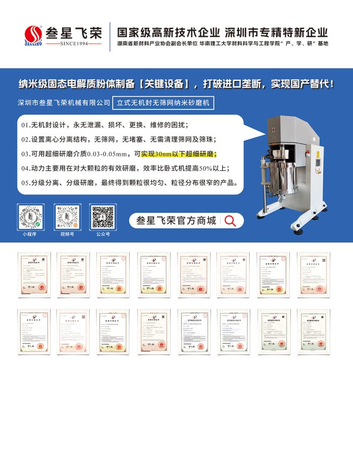 深圳市叁星飛榮機(jī)械有限公司始建于1994年,是一家為全球材料生產(chǎn)企業(yè)和科研機(jī)構(gòu)提供粉體制備智能生產(chǎn)解決方案和砂磨機(jī)設(shè)備的國家級(jí)高新技術(shù)企業(yè)。