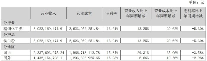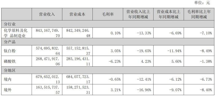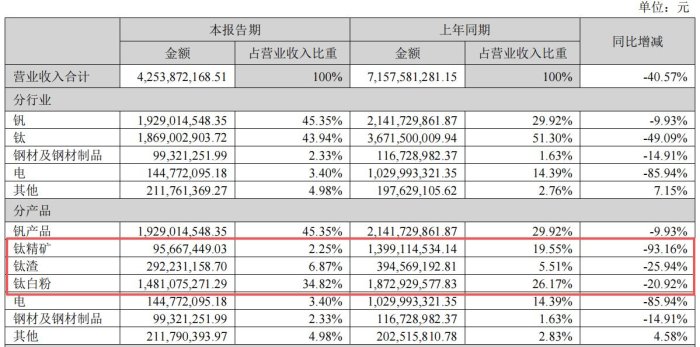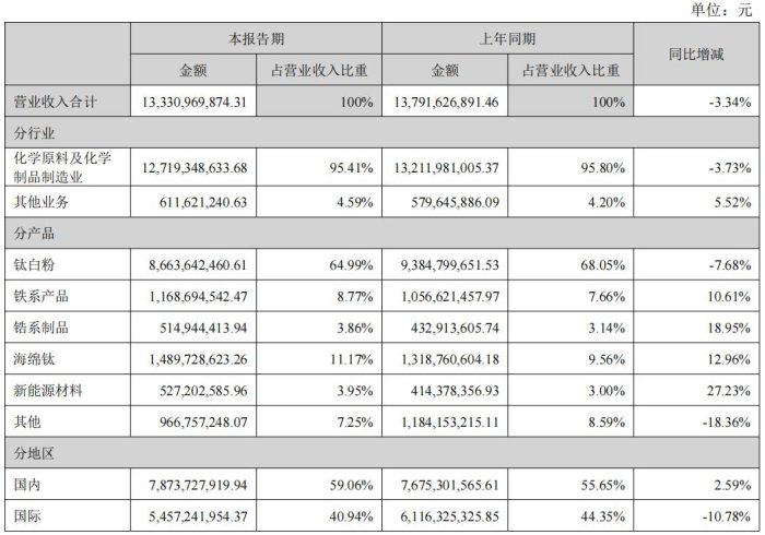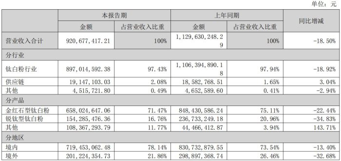 報(bào)告期內(nèi),鈦精礦營收95,667,449.03元,同比減少93.16%,鈦白粉營收1,481,075,271.29元,同比減少20.92%。