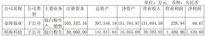 公司全資子公司金海鈦業(yè)和祥?萍脊餐M成公司鈦白粉業(yè)務(wù)板塊。其中,金海鈦業(yè)擁有年產(chǎn)超20萬噸的硫酸法鈦白粉生產(chǎn)線,報(bào)告期內(nèi)鈦白粉營收131,694.58萬元,營業(yè)利潤228.94萬元。祥海科技目前擁有年產(chǎn)6萬噸氯化法鈦白粉生產(chǎn)線,營業(yè)收入39,383.02萬元,營業(yè)利潤1,409.86萬元。