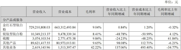 報(bào)告期內(nèi),惠云鈦業(yè)金紅石型鈦白粉營收729,210,808.03元,同比增長0.84%,毛利率9.04%,同比減少0.32%。銳鈦型鈦白粉營收10,349,213.37元,同比減少48.78%,毛利率8.41%,同比增長4.12%。