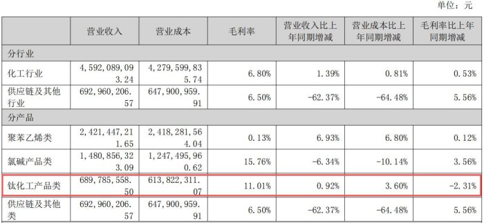 報(bào)告期內(nèi),天原股份鈦化工產(chǎn)品營收689,785,558.50元,同比增加0.92%,毛利率減少2.31%。