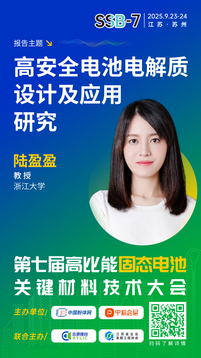 針對(duì)固態(tài)電池產(chǎn)業(yè)化發(fā)展現(xiàn)狀,中國(guó)粉體網(wǎng)聯(lián)合合源鋰創(chuàng)、江蘇省企業(yè)發(fā)展工程協(xié)會(huì)將于2025年9月23-24日在江蘇· 蘇州舉辦第七屆高比能固態(tài)電池關(guān)鍵材料技術(shù)大會(huì)。為致力于固態(tài)電池技術(shù)開發(fā)的企業(yè),科研院校,以及新能源汽車、儲(chǔ)能、消費(fèi)電子等終端企業(yè)提供信息交流的平臺(tái),開展產(chǎn)、學(xué)、研合作。屆時(shí),來自浙江大學(xué)的陸盈盈教授將作題為《高安全電池電解質(zhì)設(shè)計(jì)及應(yīng)用研究》的報(bào)告。