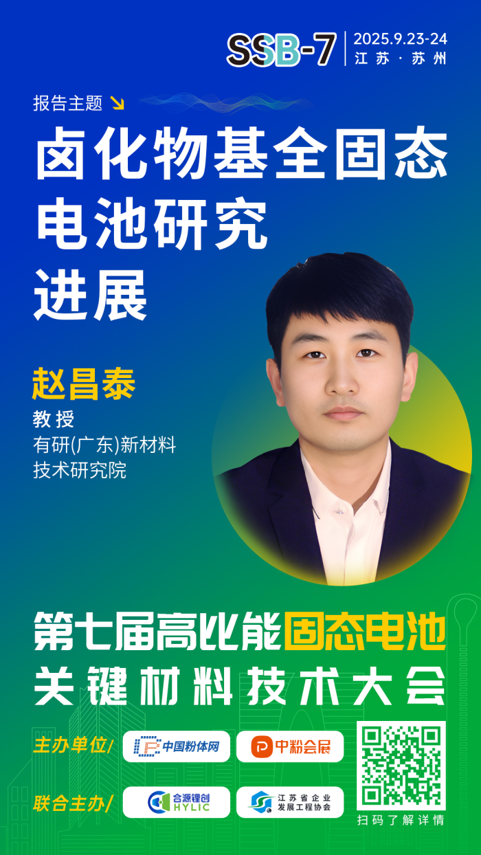 針對(duì)固態(tài)電池產(chǎn)業(yè)化發(fā)展現(xiàn)狀,中國(guó)粉體網(wǎng)聯(lián)合合源鋰創(chuàng)、江蘇省企業(yè)發(fā)展工程協(xié)會(huì)將于2025年9月23-24日在江蘇· 蘇州舉辦第七屆高比能固態(tài)電池關(guān)鍵材料技術(shù)大會(huì)。為致力于固態(tài)電池技術(shù)開(kāi)發(fā)的企業(yè),科研院校,以及新能源汽車、儲(chǔ)能、消費(fèi)電子等終端企業(yè)提供信息交流的平臺(tái),開(kāi)展產(chǎn)、學(xué)、研合作。屆時(shí),來(lái)自有研(廣東)新材料技術(shù)研究院的趙昌泰教授將作題為《鹵化物基全固態(tài)電池研究進(jìn)展》的報(bào)告。