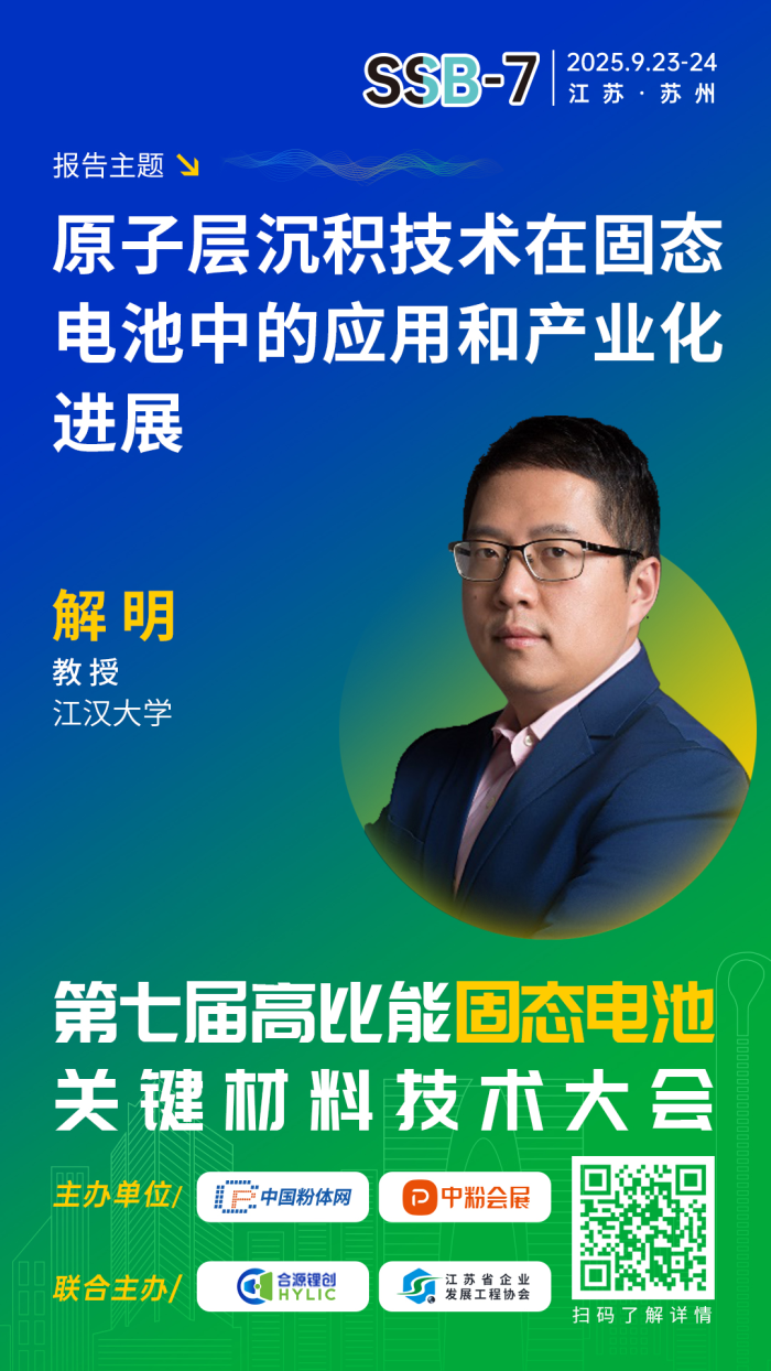 針對固態(tài)電池產(chǎn)業(yè)化發(fā)展現(xiàn)狀,中國粉體網(wǎng)聯(lián)合合源鋰創(chuàng)、江蘇省企業(yè)發(fā)展工程協(xié)會將于2025年9月23-24日在江蘇· 蘇州舉辦第七屆高比能固態(tài)電池關(guān)鍵材料技術(shù)大會。為致力于固態(tài)電池技術(shù)開發(fā)的企業(yè),科研院校,以及新能源汽車、儲能、消費電子等終端企業(yè)提供信息交流的平臺,開展產(chǎn)、學(xué)、研合作。屆時,來自江漢大學(xué)的解明教授將作題為《原子層沉積技術(shù)在固態(tài)電池中的應(yīng)用和產(chǎn)業(yè)化進(jìn)展》的報告。