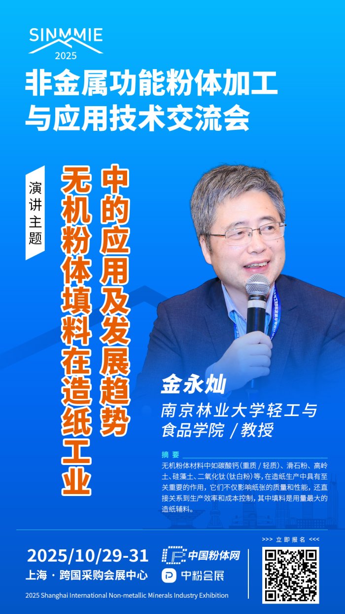 10月29-31日,北京粉體技術(shù)協(xié)會、柏德英思展覽(上海)有限公司、山東中粉會展服務(wù)有限公司將在上?鐕少彆怪行穆(lián)合主辦“上海國際非金屬礦工業(yè)展覽會(SINMMIE2025)”,展會現(xiàn)場將同期舉辦“非金屬功能粉體加工與應(yīng)用技術(shù)交流會”,屆時將邀請南京林業(yè)大學(xué)金永燦教授作《無機(jī)粉體填料在造紙工業(yè)中的應(yīng)用及發(fā)展趨勢》主題報告,分享碳酸鈣、高嶺土、滑石粉、硅灰石、鈦白粉等粉體材料在造紙行業(yè)中的應(yīng)用技術(shù)和研究成果。