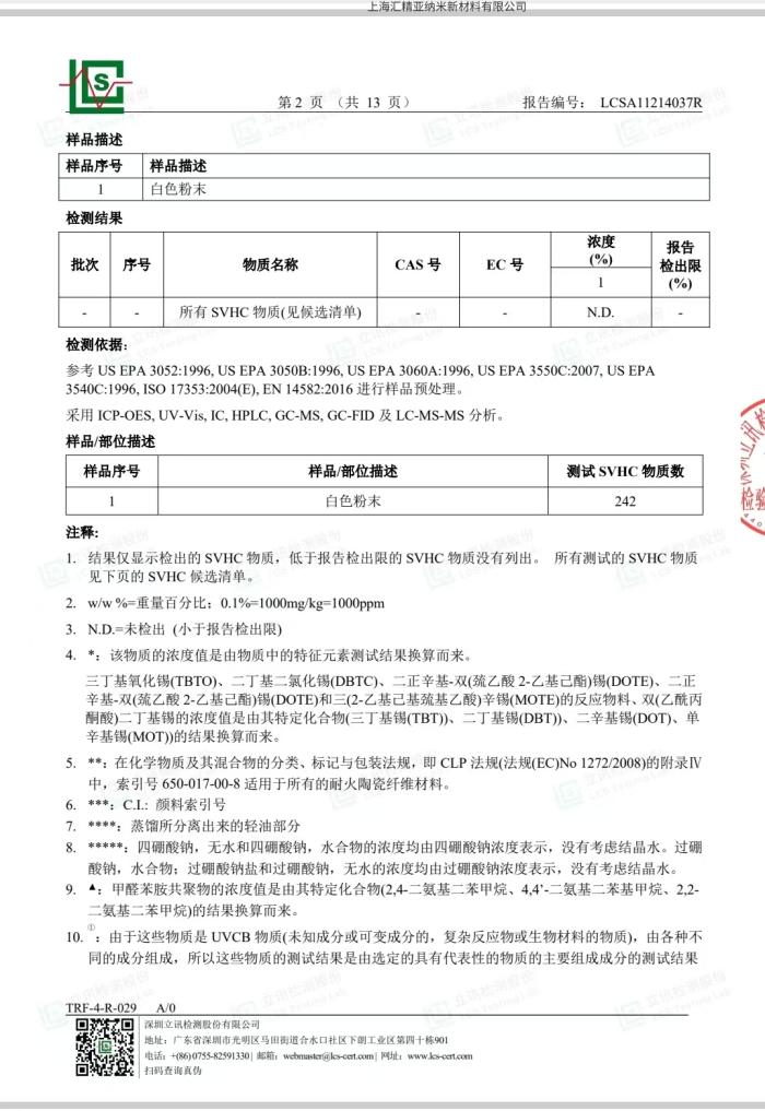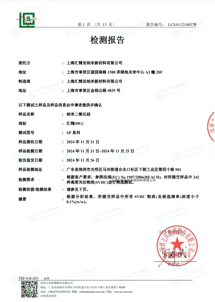 值得一提的,匯精亞納米新材料的二氧化硅產(chǎn)品已通過了第三方機(jī)構(gòu)檢測(cè),檢測(cè)報(bào)告如下: