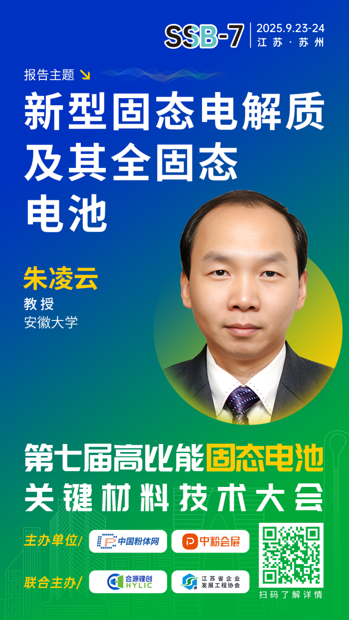 針對固態(tài)電池產業(yè)化發(fā)展現(xiàn)狀,中國粉體網聯(lián)合合源鋰創(chuàng)、江蘇省企業(yè)發(fā)展工程協(xié)會將于2025年9月23-24日在江蘇· 蘇州舉辦第七屆高比能固態(tài)電池關鍵材料技術大會。為致力于固態(tài)電池技術開發(fā)的企業(yè),科研院校,以及新能源汽車、儲能、消費電子等終端企業(yè)提供信息交流的平臺,開展產、學、研合作。屆時,來自安徽大學的朱凌云教授將作題為《新型固態(tài)電解質及其全固態(tài)電池》的報告。
